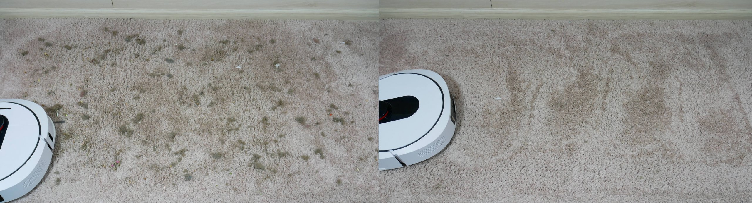 El rendimiento de limpieza de alfombras no es perfecto, pero es adecuado para el uso diario. Se quedaron muy pocos residuos atascados en el pelo, debido a la baja potencia de succión y al cepillo flotante incompleto. Sin embargo, en comparación con robots similares, el rendimiento de limpieza de alfombras de este robot es prácticamente igual.