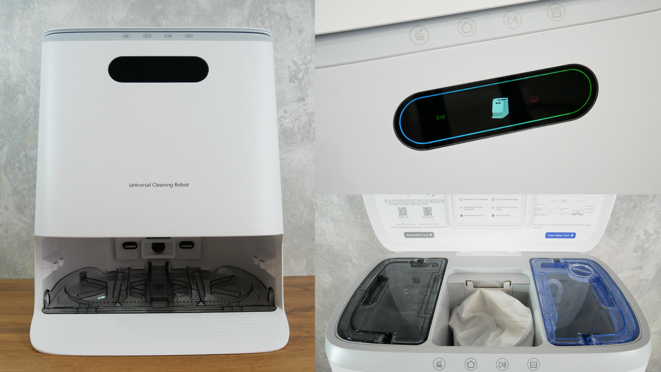 Ahora veamos la estación en sí. Cuenta con botones de control táctiles y una pantalla informativa. Una solución práctica. Bajo la tapa superior se encuentran los tanques para agua sucia y limpia, así como una bolsa para desechos.