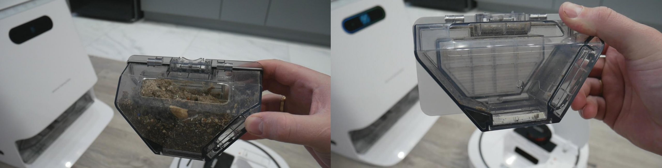Inmediatamente después de las pruebas de polvo, comprobamos el rendimiento de la autolimpieza. Se puede ver que el depósito de polvo está completamente lleno. Y ahora la estación lo vacía sin problemas, prácticamente a la perfección. La autolimpieza del Roidmi EVA está bien implementada.