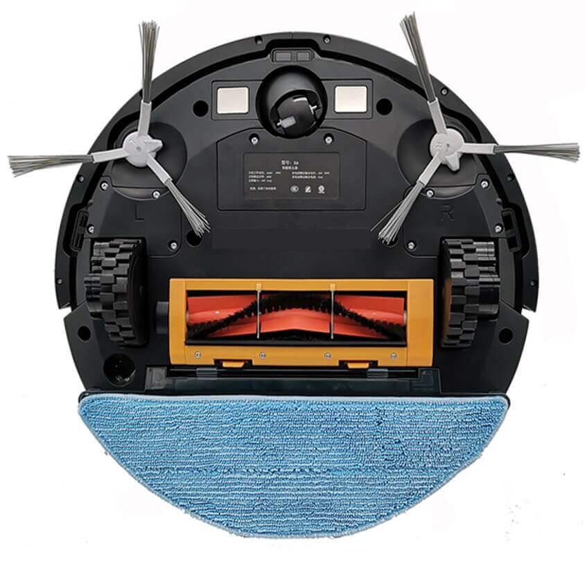 Al observar la aspiradora robot desde atrás, se aprecian las ruedas motrices laterales, una rueda giratoria universal, contactos de carga para acoplarla a la base, un compartimento para la batería, sensores de altura, dos cepillos laterales y un cepillo turbo central con protección antipelusas. Un paño de microfibra para limpieza en húmedo también está fijado en la parte inferior, cerca del depósito de agua.