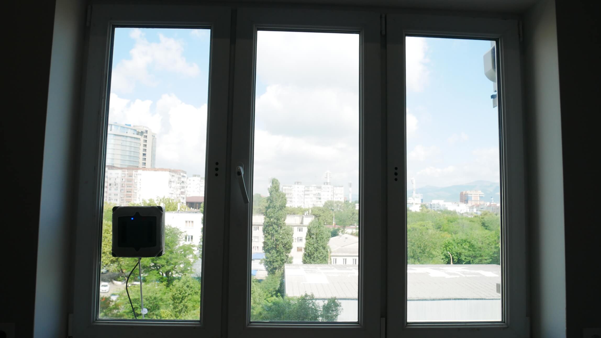 Primero, probamos la navegación del robot en ventanas de diferentes tamaños. En mi caso, la ventana más estrecha mide 38 cm de ancho. Una sección de la puerta del balcón también tiene el mismo ancho. El robot se mueve y gira sin problemas, sin dejar zonas sin limpiar. Según el fabricante, puede limpiar incluso ventanas de hasta 27 cm de ancho, ¡lo cual es impresionante!