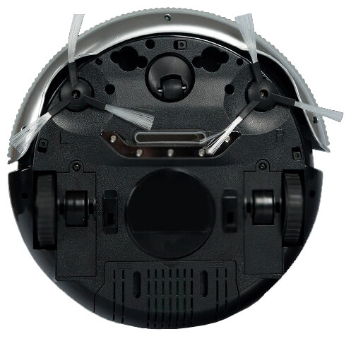 Al girar la aspiradora, verá dos ruedas motrices y un rodillo fijo que permiten que el robot aspirador Clever & Clean 002 Serie M se mueva y cambie de dirección dentro de la habitación. En el centro hay un orificio para aspirar residuos y pelos de mascotas. Como el robot puede fregar en húmedo, en la parte inferior hay un accesorio especial para un paño de limpieza.