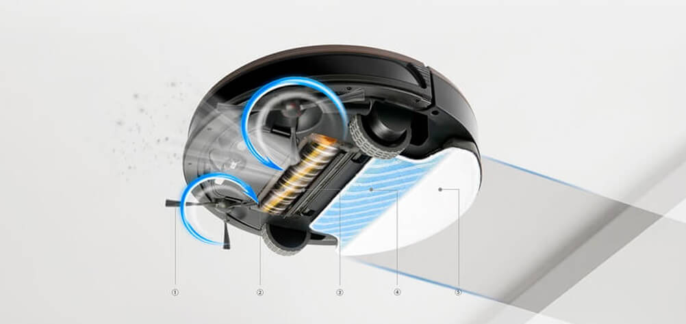 Para moverse por las superficies y dar maniobrabilidad al robot aspirador, se proporcionan dos ruedas delanteras accionadas por resorte, gracias a las cuales puede superar fácilmente umbrales de hasta 18 mm de alto, circular sobre alfombras y una rueda giratoria.