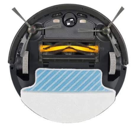 Para una limpieza húmeda completa de pisos, el dispositivo cuenta con un módulo especial con un paño de microfibra extraíble y un tanque de agua que humedece automáticamente la mitad azul de la boquilla mientras la mitad blanca seca el piso. Para una mayor eficiencia de limpieza, dos cepillos laterales giratorios recogen los residuos en áreas de difícil acceso, como esquinas y zócalos.