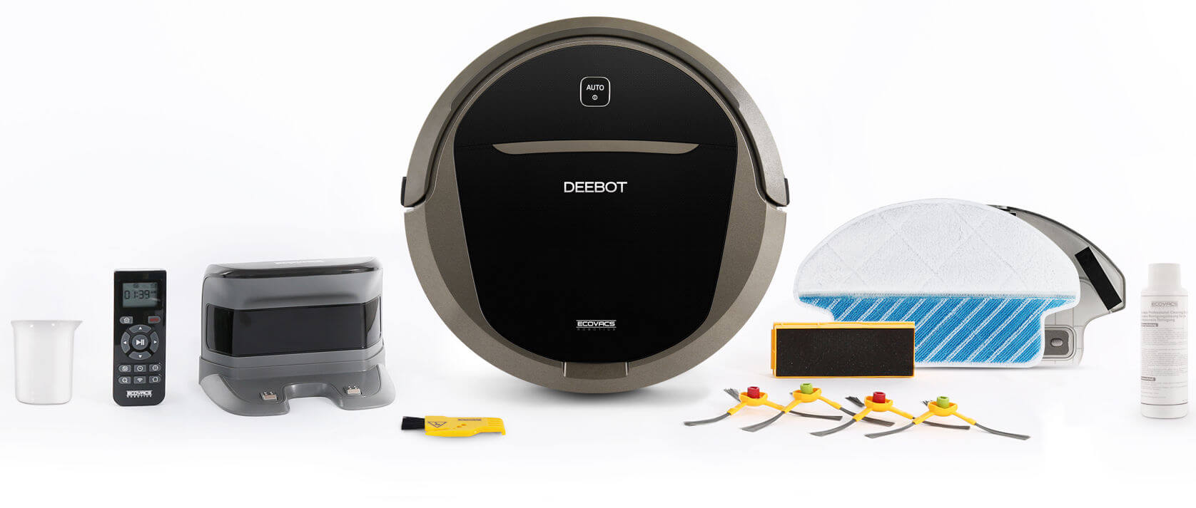 El paquete incluye el propio robot aspirador DeeBot, así como todos los componentes y accesorios necesarios para su mantenimiento: