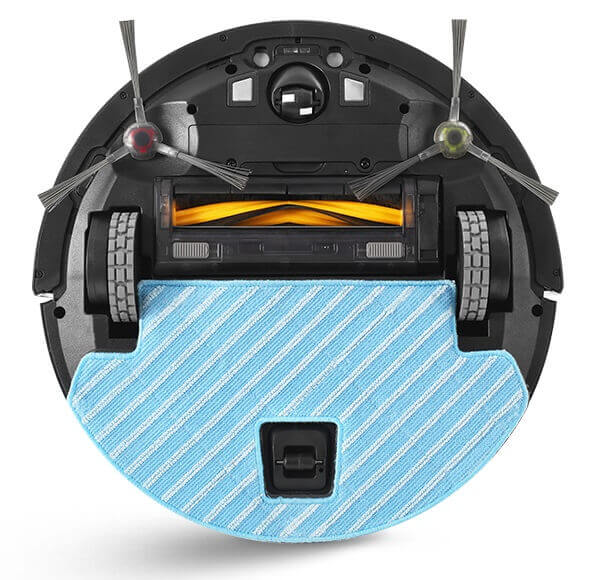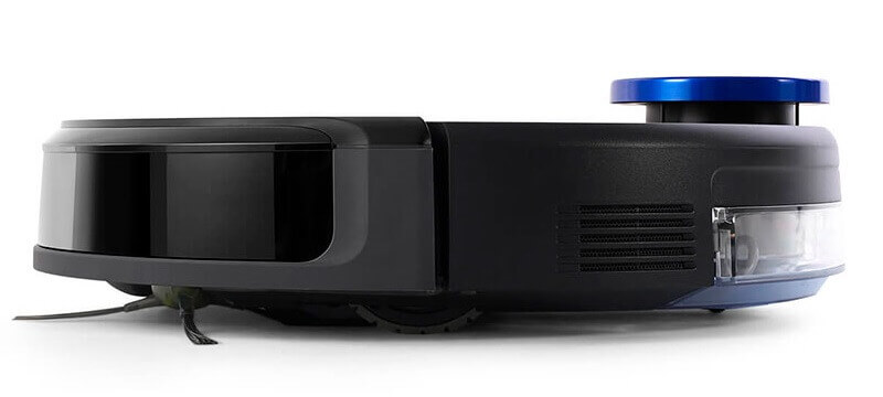 En el lateral del Ecovacs Deebot Ozmo 930 hay un parachoques protector, orificios de escape y un colector de polvo, que se puede sustituir por un recipiente con agua para limpiar el suelo en húmedo (la otra parte es visible desde abajo).