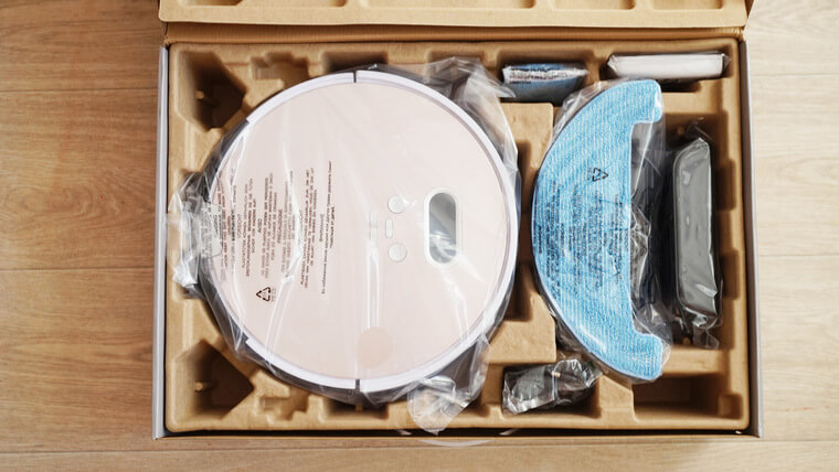 El robot se entrega en un atractivo embalaje con información sobre el dispositivo impresa en los bordes. Las dimensiones de la caja (LxAnxAl) son 585x135x390 mm. Incluye un asa de plástico para facilitar su transporte y un precinto para evitar accidentes.