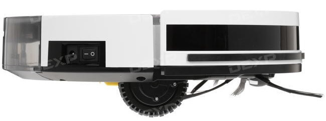 En la parte inferior del robot DEXP LF-800 se encuentran los contactos de carga para la estación de acoplamiento, dos cepillos laterales, un cepillo turbo, un compartimento para baterías, un conjunto de cuatro sensores de desnivel y un sistema de propulsión de tres ruedas. Este sistema consta de un rodillo frontal de giro libre y dos ruedas motrices laterales con motores integrados. Pequeños motores están unidos a un chasis con resortes para evitar obstáculos con éxito. Cada rueda está montada sobre un neumático de goma con banda de rodadura, lo que le permite desplazarse por terrenos difíciles y evitar resbalones en suelos mojados.