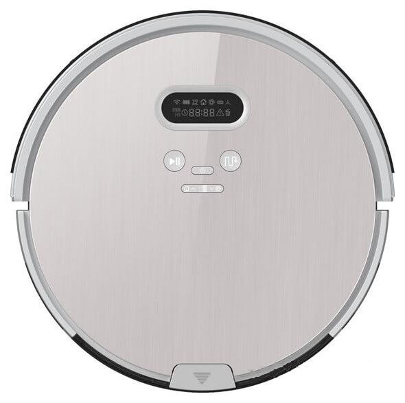 Al observar el robot aspirador desde arriba, vemos una fila de botones de control y una pantalla LCD que muestra el estado actual y la configuración del programa. En el panel superior también hay un botón para extraer el depósito de polvo, que se desliza lateralmente. Además, en el lateral hay un parachoques protector con sensores de obstáculos, un botón de encendido y un puerto para conectar el adaptador de corriente y cargarlo directamente desde la pared.