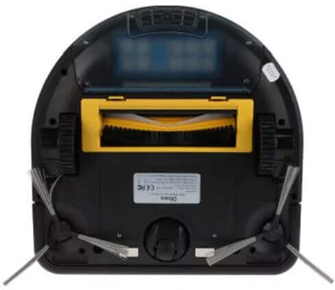 Una vista del robot desde abajo: aquí están las almohadillas de contacto para la carga automática en la base, ruedas de desplazamiento, una rueda giratoria en la parte delantera, dos cepillos laterales, un cepillo turbo central, una tapa del compartimento de la batería, sensores anticaída y un área para instalar una boquilla de limpieza húmeda.