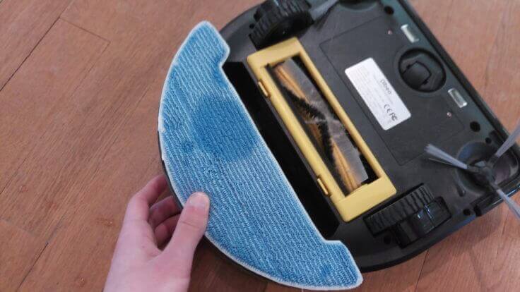 Para que la aspiradora robot pueda fregar el suelo, llene el depósito especial con agua e instálelo en lugar del depósito de polvo. A continuación, coloque un paño de microfibra en la base de la aspiradora para asegurar una humectación uniforme durante el funcionamiento.