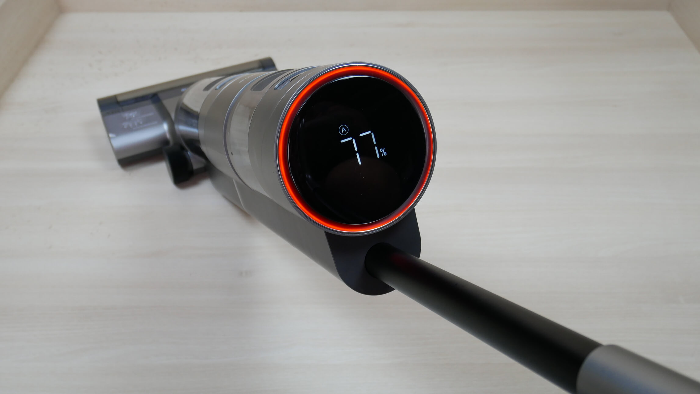 Una pantalla LED muy informativa se encuentra sobre el tanque. Muestra el porcentaje de batería, el modo de funcionamiento y los mensajes de servicio. Un indicador luminoso alrededor de la pantalla indica el nivel de potencia de succión.