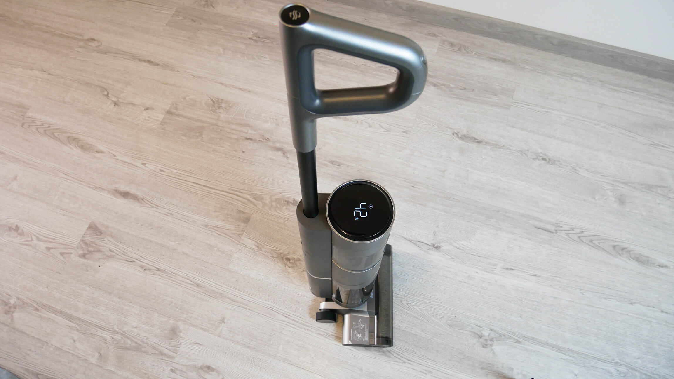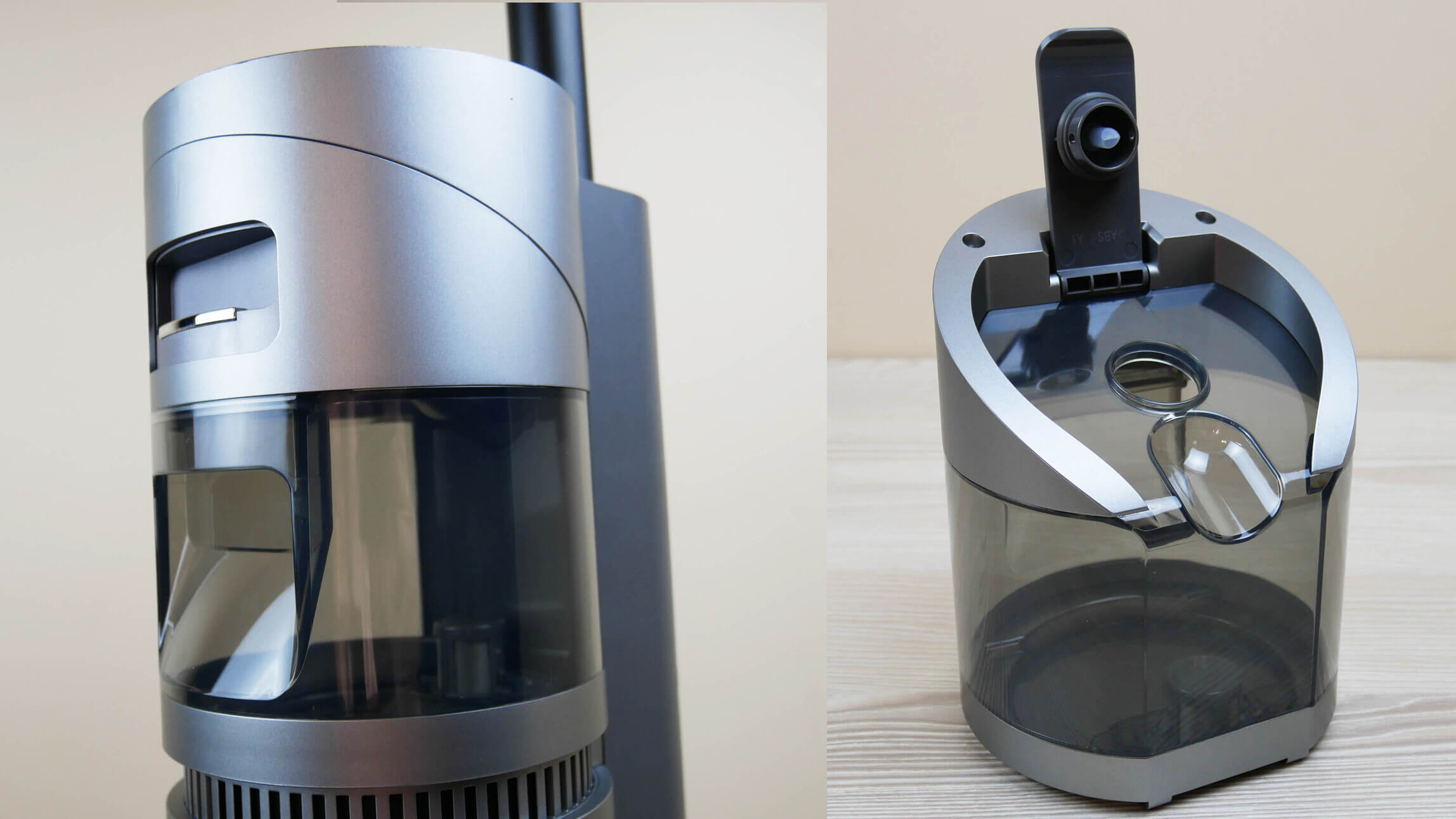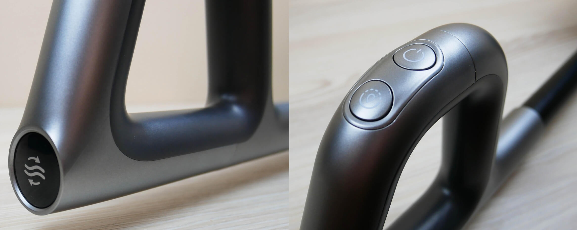 El mango contiene tres botones de control mecánicos: encendido y apagado, cambio entre dos modos de funcionamiento (automático y recogida de líquido) e inicio de la función de autolimpieza cuando la aspiradora se coloca en la estación de carga.