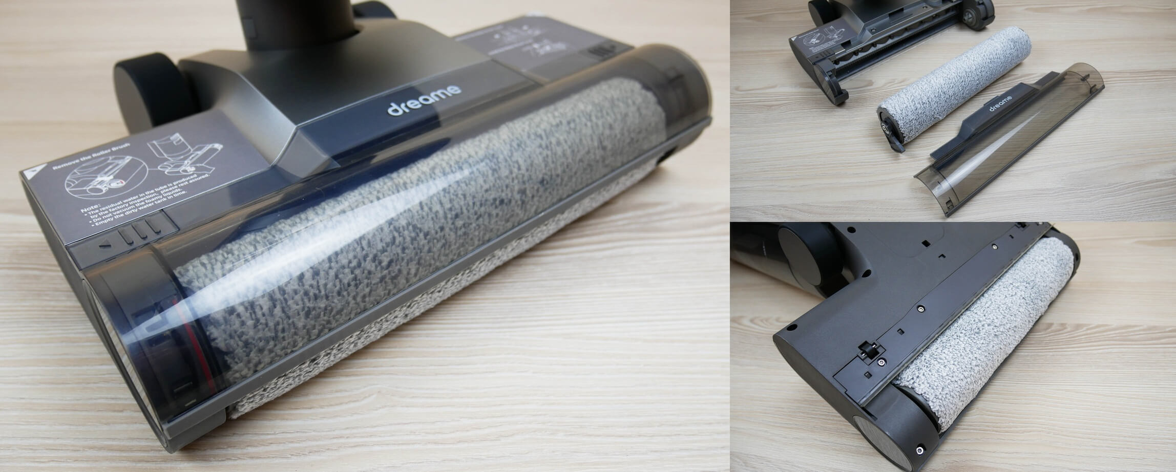 Echemos un vistazo al diseño de la aspiradora vertical en seco y húmedo Dreame H11 Max. Empecemos por el módulo de limpieza. El rodillo se encuentra tras una cubierta transparente que se bloquea por ambos lados. El rodillo está hecho de cerdas suaves. Detrás del rodillo, frente a la abertura de succión, hay un peine para desenredar el pelo y el de las mascotas. Debajo, también detrás del rodillo, hay una escobilla de goma para recoger líquidos y residuos del suelo. También podemos observar que el rodillo no llega hasta el borde, lo que probablemente significa que esta unidad no es capaz de limpiar a fondo el área del zócalo, como se confirmará en las pruebas.