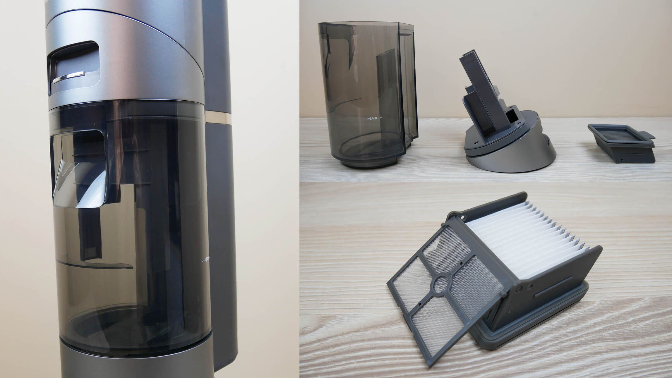 El tanque de agua sucia se encuentra encima del módulo de limpieza. Contiene un filtro HEPA con malla y un sistema de sensores para monitorear el nivel de agua. Cuando el tanque esté lleno de agua sucia, el Dreame H11 Max le avisará para que lo vacíe.