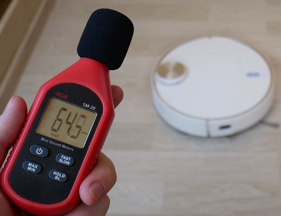 Finalmente, medimos el nivel de ruido del Eufy RoboVac L70 Hybrid en diferentes modos. En modo de pulido, alcanza 59 dB durante la aceleración; a potencia estándar, 62 dB; en modo turbo, el nivel de ruido no supera los 65,5 dB; y a máxima potencia, el pico ronda los 71 dB. Este robot aspirador es bastante ruidoso al funcionar a máxima potencia. En modo estándar, el nivel de ruido es promedio.