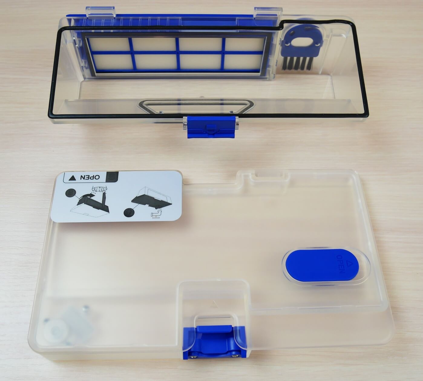 En términos de diseño, es muy similar a la solución implementada en Mi Robot Aspirador Mop EssentialEl contenedor incluye una herramienta para limpiar el colector de polvo y el cepillo central. También incluye un filtro HEPA.
