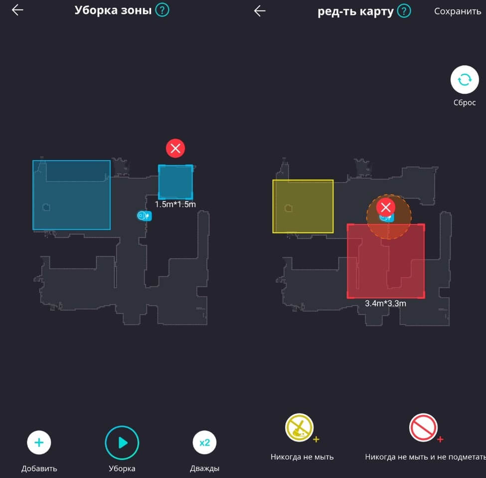 Los siguientes botones de la fila activan el modo de limpieza automática y obligan al robot a regresar a la base para cargarse. Veamos la fila inferior de botones. Este modo permite limpiar zonas seleccionadas en el mapa y elegir el número de veces que el robot pasará por ellas (1 o 2). Puedes configurar un programa de limpieza seleccionando la potencia de succión, la hora y los días de la semana. También puedes establecer zonas de exclusión en el mapa. También puedes consultar el registro de limpieza.