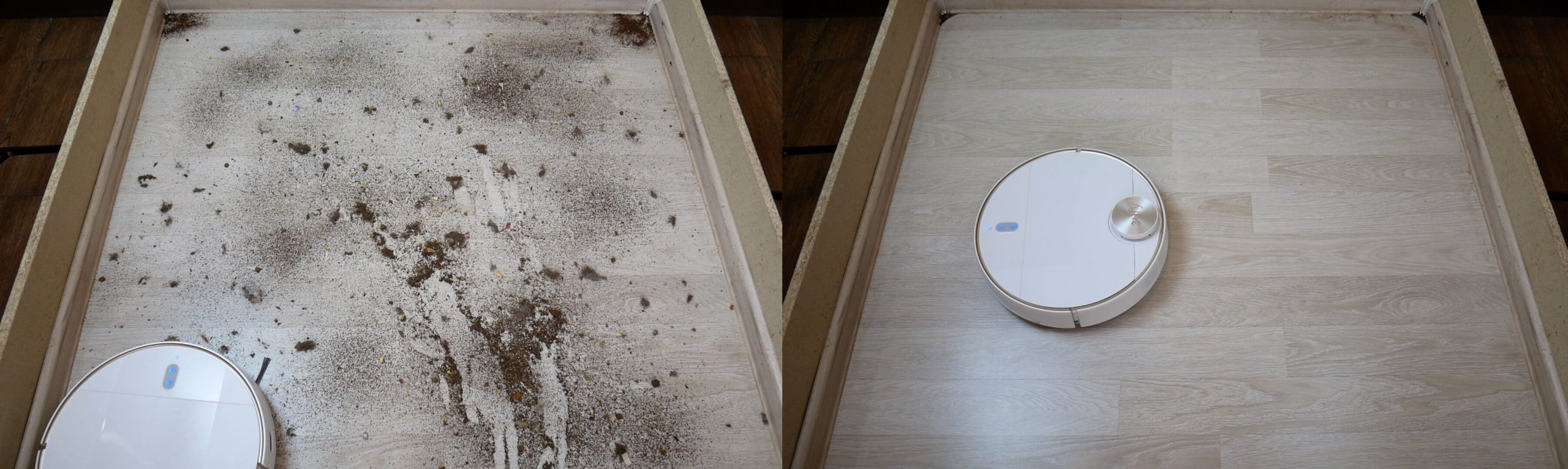 En cuanto a la limpieza en húmedo, el robot es capaz de fregar la suciedad seca del suelo. La única zona que no pudo limpiar fue el zócalo.