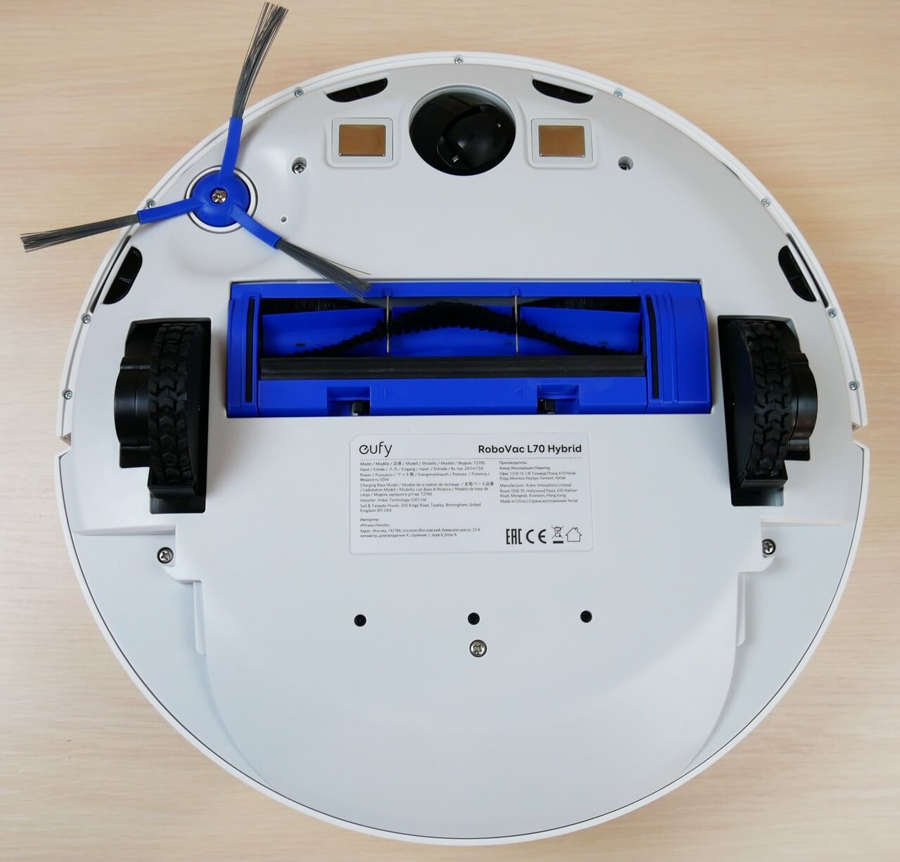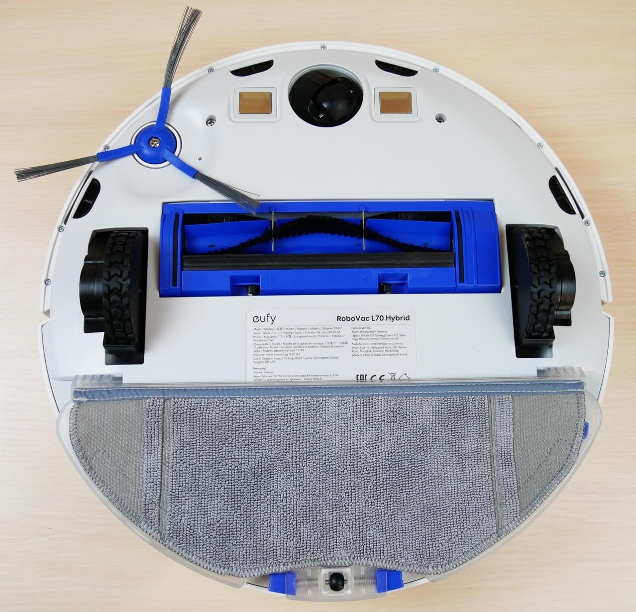 Echemos un vistazo a la parte inferior del Eufy RoboVac L70 Hybrid. Tiene un solo cepillo lateral, fijado con un tornillo. Tiene tres cerdas y está equipado con cuatro sensores anticaída.
