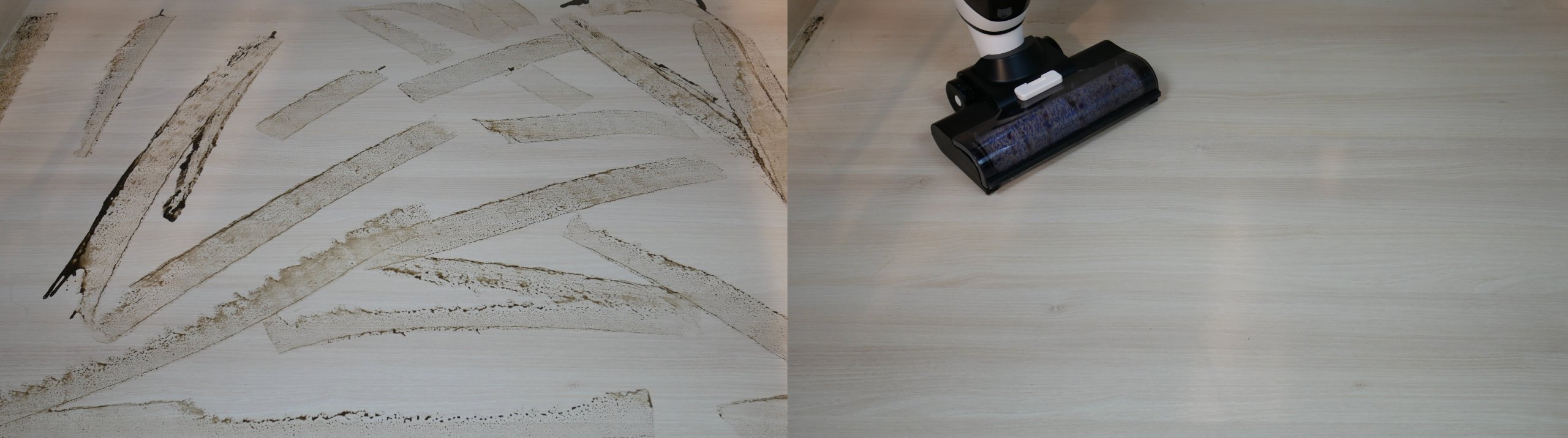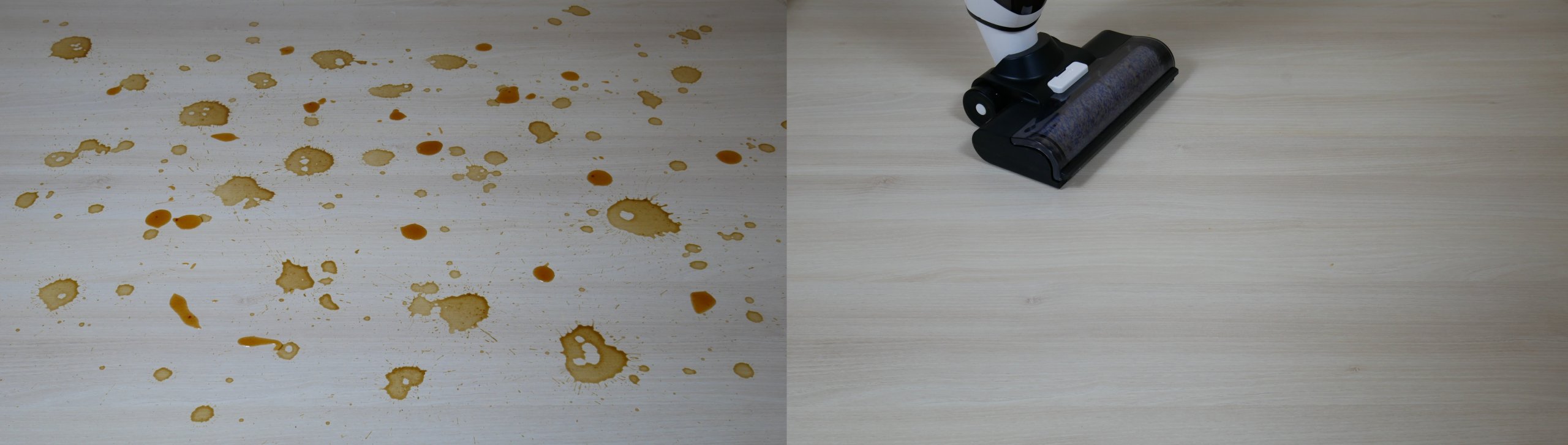 La siguiente prueba consistió en eliminar manchas secas de café y salsa. La Genio Magic Wash T10 tuvo dificultades para eliminarlas. Tardó casi 10 minutos. Sin embargo, tenga en cuenta que el suelo se lavó con agua limpia. Si hubiera añadido un limpiador sin espuma al depósito, creo que la aspiradora habría terminado la tarea más rápido.