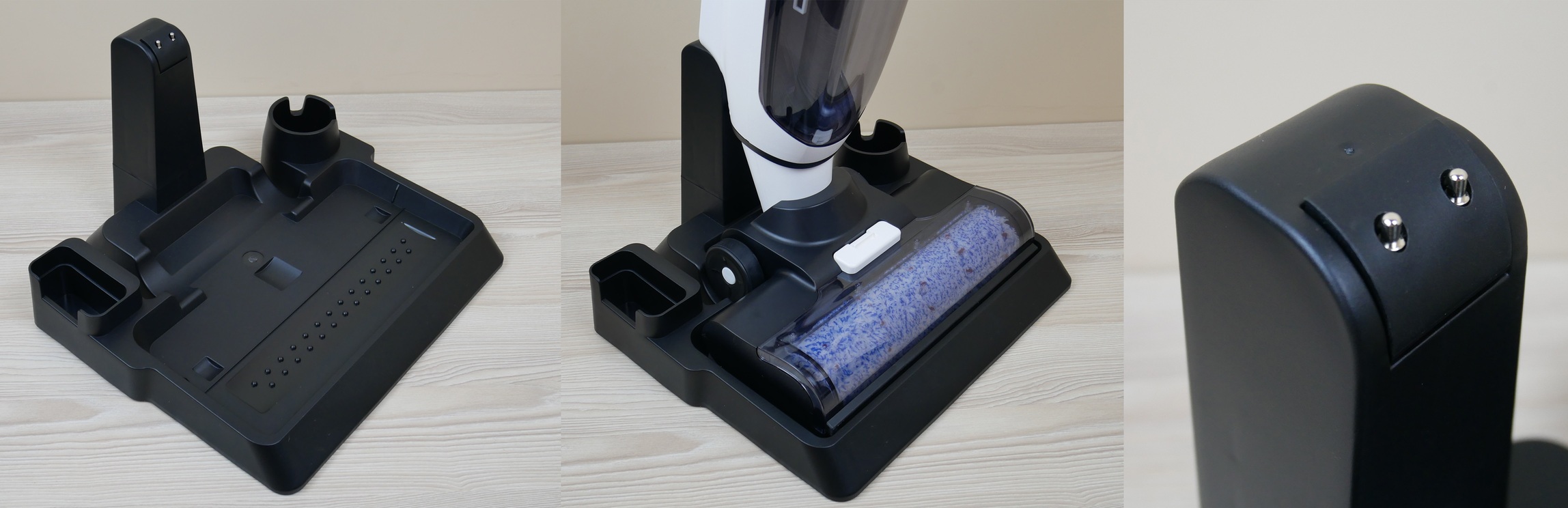 La estación se puede utilizar para almacenar accesorios y repuestos, cargar la aspiradora y activar la función de autolimpieza, que se demostrará durante las pruebas.