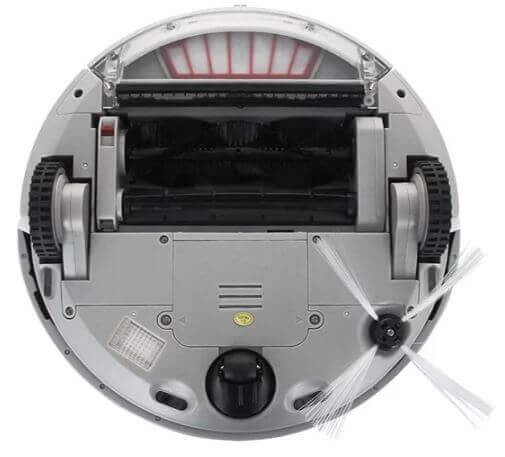 Una mirada a la parte inferior del robot aspirador revela las ruedas laterales, el rodillo frontal para girar, la tapa del compartimento de la batería, un cepillo lateral, dos cepillos en el centro del dispositivo, una lámpara ultravioleta, sensores de detección de superficie y un área para colocar un panel extraíble con un paño de microfibra.