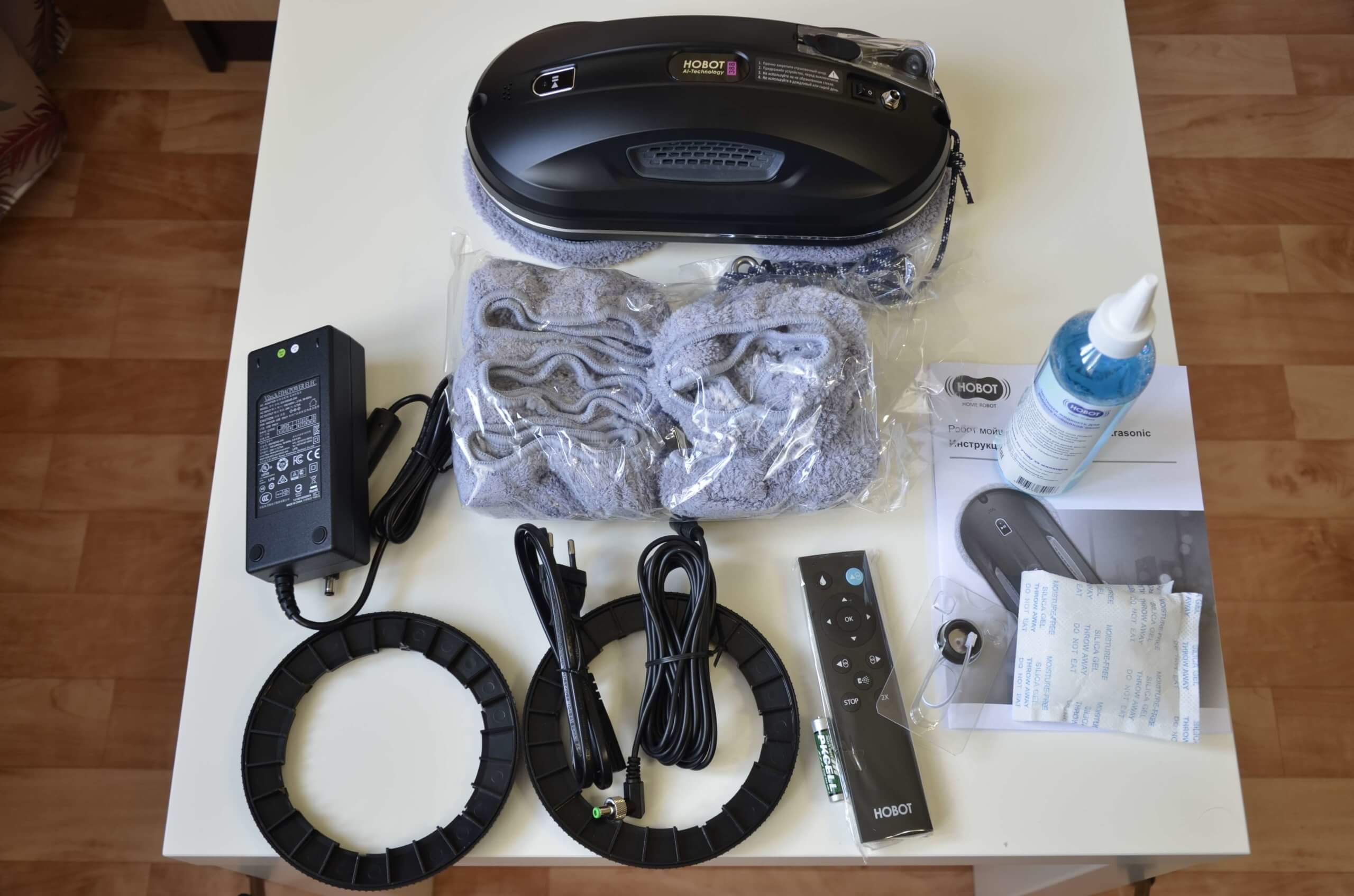 Comencemos con una descripción general de los componentes. El robot limpiacristales se presenta en una caja compacta y elegante. Es bastante informativo. Primero, se menciona la característica principal del modelo: el rociador ultrasónico de líquidos. Por cierto, se trata de un sistema único; otro robot limpiacristales de la línea Hobot está equipado con un rociador similar. Hobot 298 Ultrasónico, que también revisamos anteriormente.