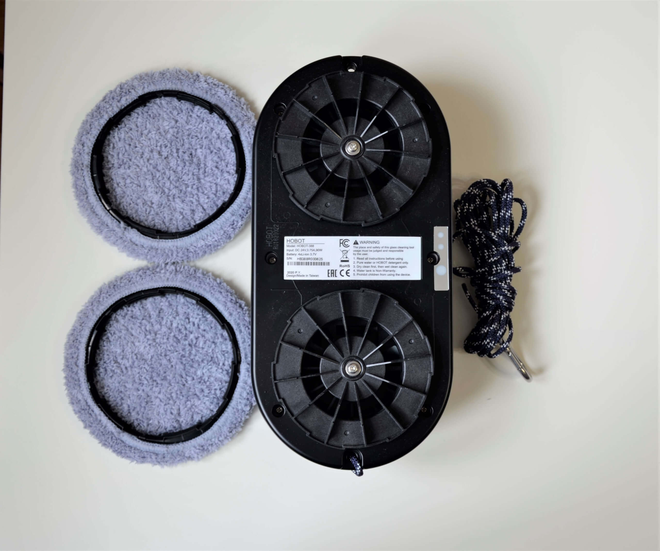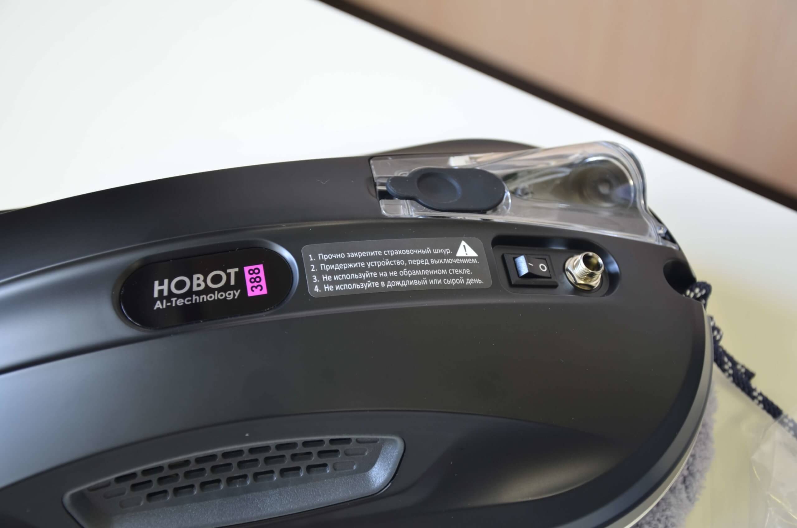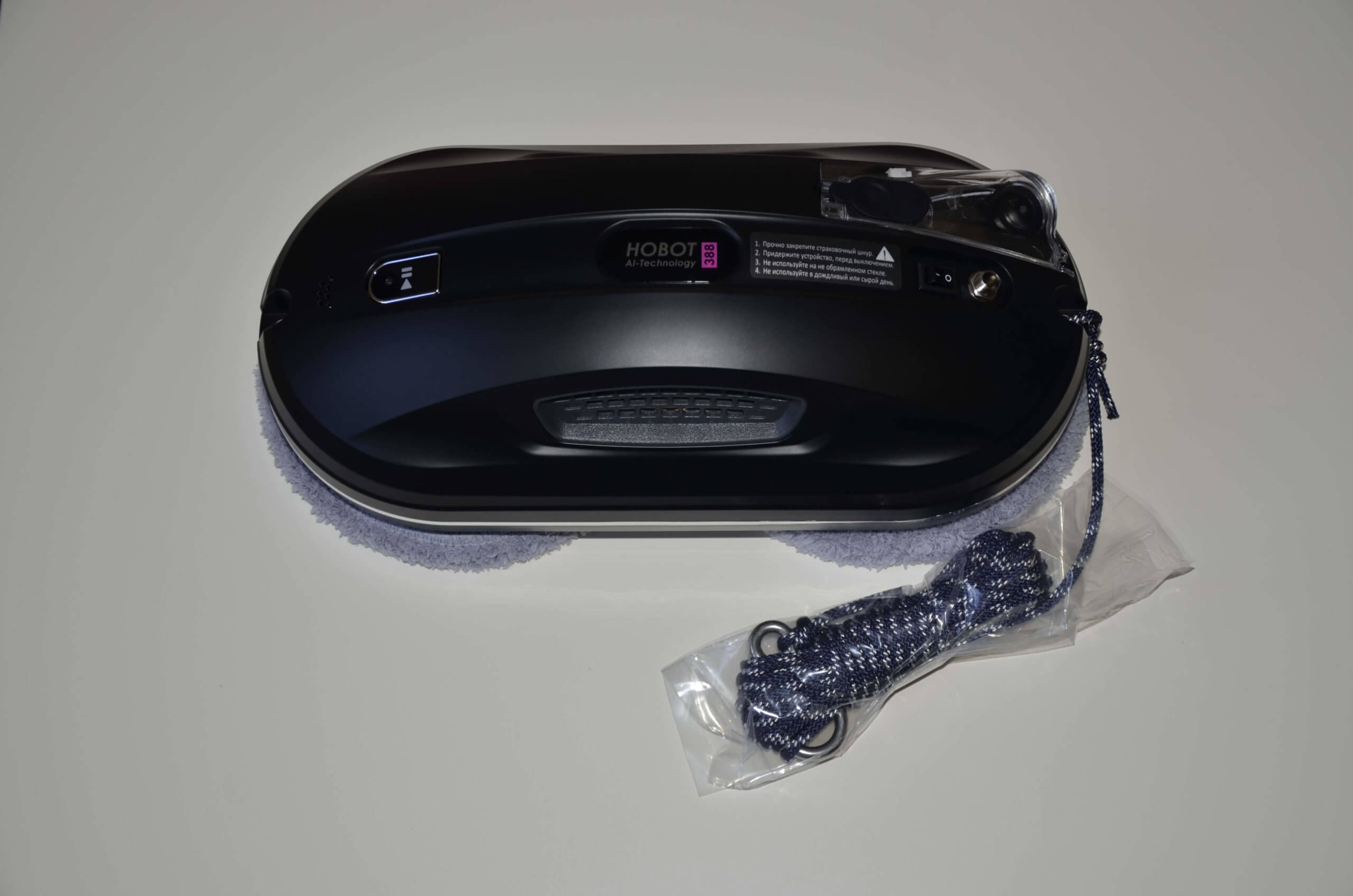 Veamos el robot con más detalle. El Hobot 388 Ultrasonic es negro y está hecho de plástico mate que no deja pasar la suciedad. En la parte superior, encontrará el botón de inicio, las instrucciones de seguridad, el interruptor de encendido y el conector del cable de alimentación. El robot ya viene con un cordón de seguridad.