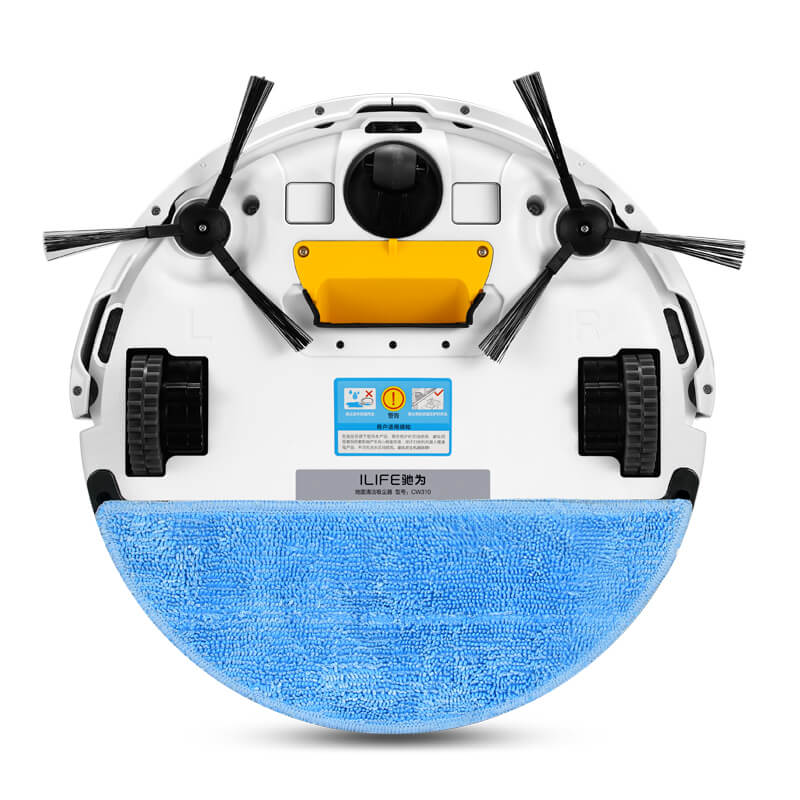 La parte inferior del dispositivo contiene almohadillas de contacto, una rueda de soporte giratoria delantera, dos ruedas laterales, cepillos laterales izquierdo y derecho, una tapa del compartimento de la batería, un tubo de succión con faldón de goma y tres sensores infrarrojos de diferencia de altura.
