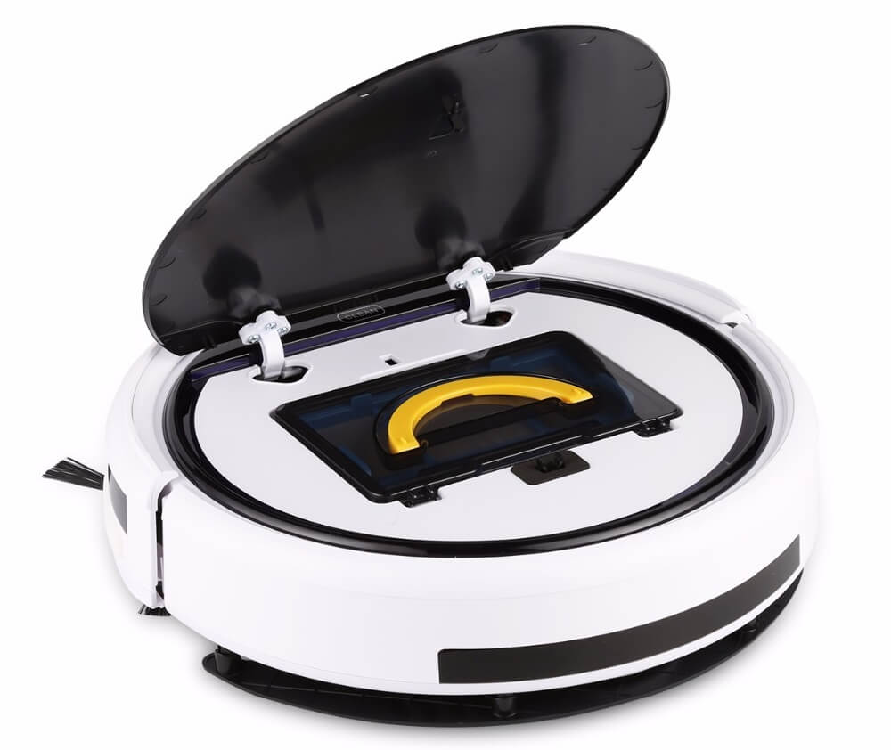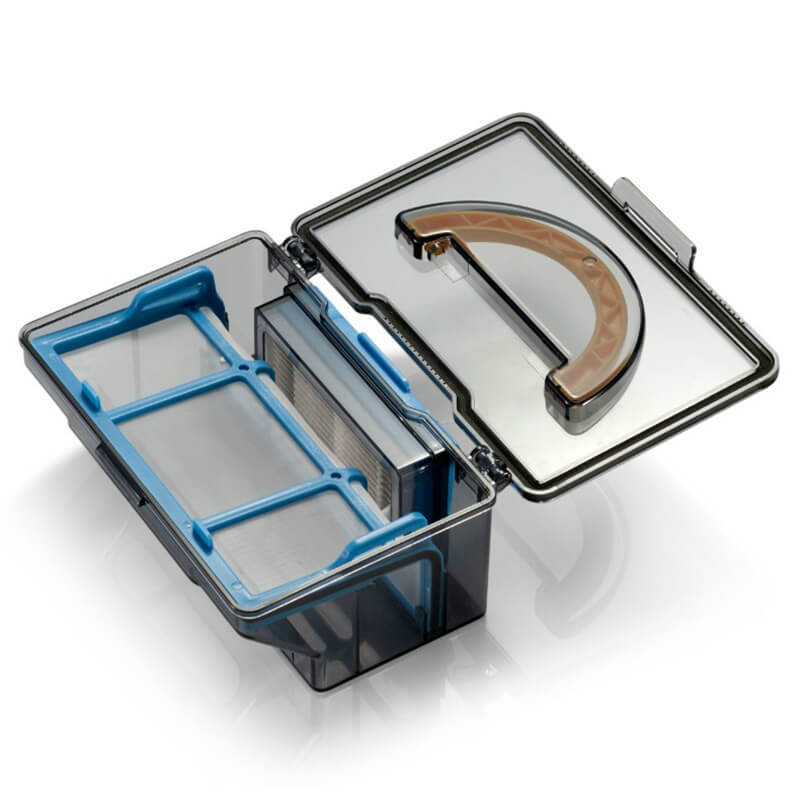 El depósito de polvo del robot aspirador consta de dos filtros (un filtro de premalla y un filtro HEPA) y tiene una capacidad de 300 mililitros, por lo que requiere una limpieza frecuente. Sin embargo, es muy sencillo: al presionar el botón del cuerpo, se abre el compartimento del depósito y el asa lo extrae fácilmente. Después, simplemente retire los filtros y sacuda la suciedad y el polvo acumulados. El depósito se puede enjuagar con agua y secar completamente. Para una limpieza en húmedo, fije un paño de microfibra al accesorio especial con velcro.