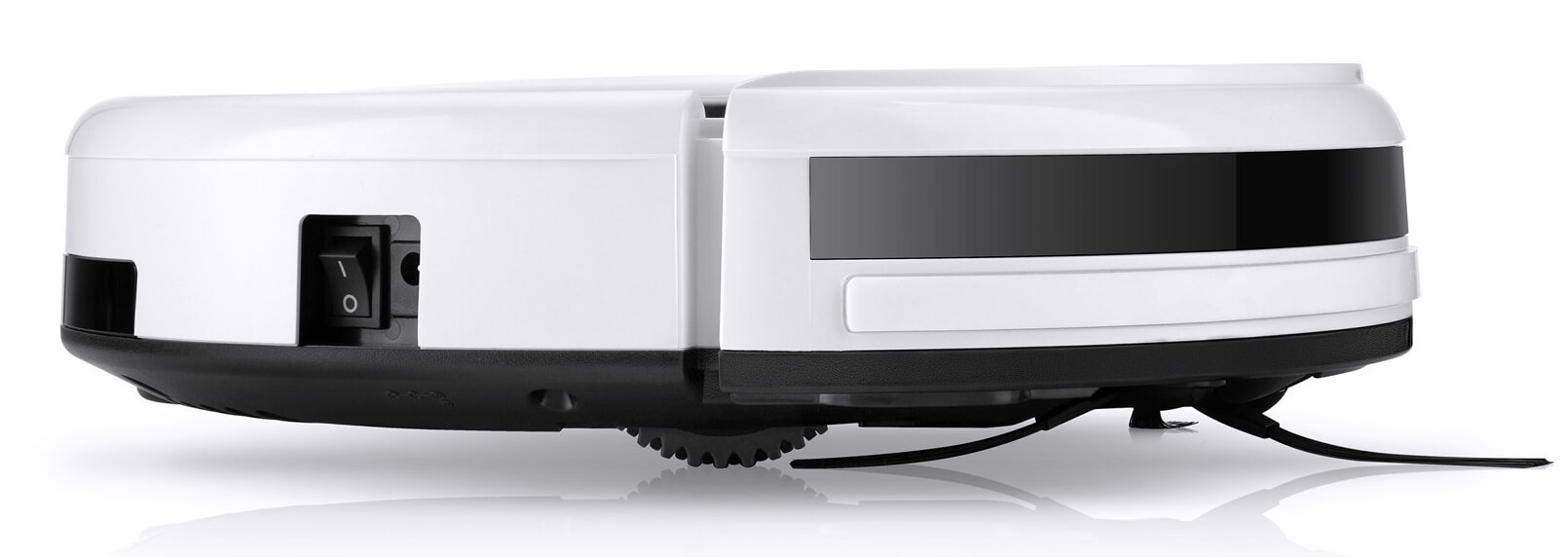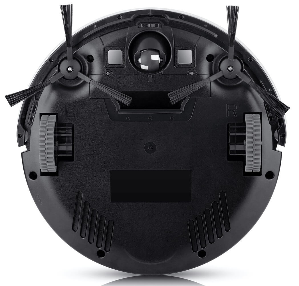 Al girar el iLife V50 Power, se descubren dos cepillos laterales y un puerto de succión. La base también cuenta con las clásicas ruedas, una rueda giratoria y terminales de carga. Si es necesario, se puede acoplar un paño de microfibra a la base, lo que permite al robot aspirador limpiar los pisos con un paño seco o húmedo mientras limpia.