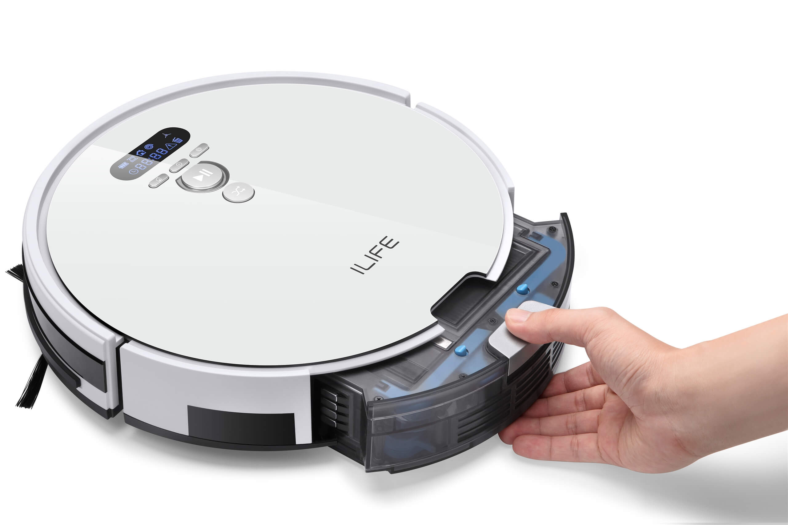 Como se mencionó anteriormente, el iLife V8 Plus es idéntico al iLife V8s. Solo ha cambiado el color de la carrocería. Los botones de control y la pantalla se encuentran en el panel superior. El depósito de polvo se puede extraer por la parte trasera. Por cierto, es bastante espacioso. El depósito de residuos sólidos tiene una capacidad de 750 ml.