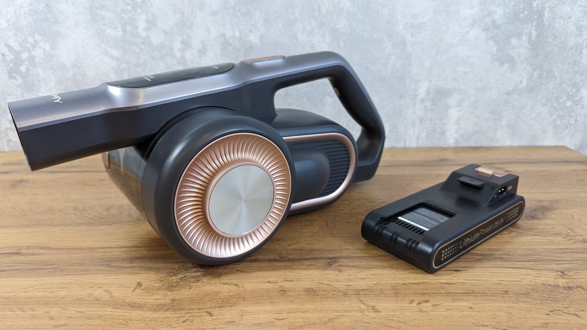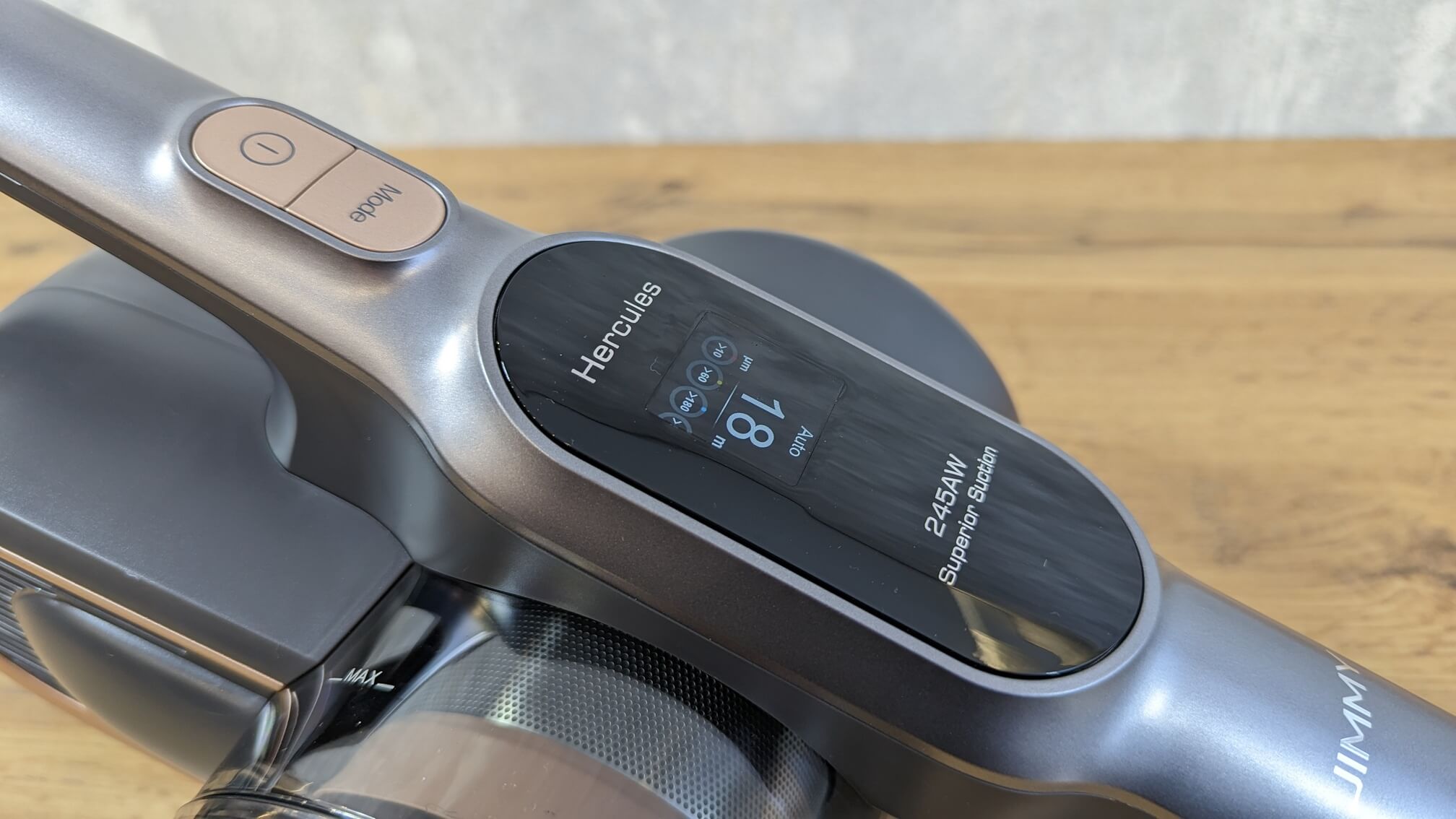 El mango de la aspiradora tiene un diseño muy práctico. Los botones de control mecánicos se encuentran debajo del pulgar: encendido/apagado y ajuste de potencia. Hay cuatro niveles de potencia: Eco, Automático, Turbo y Máximo. En modo automático, la Jimmy H10 Pro Hercules puede aumentar automáticamente la potencia de succión según el tipo de suelo y su nivel de suciedad. Esto es una ventaja.