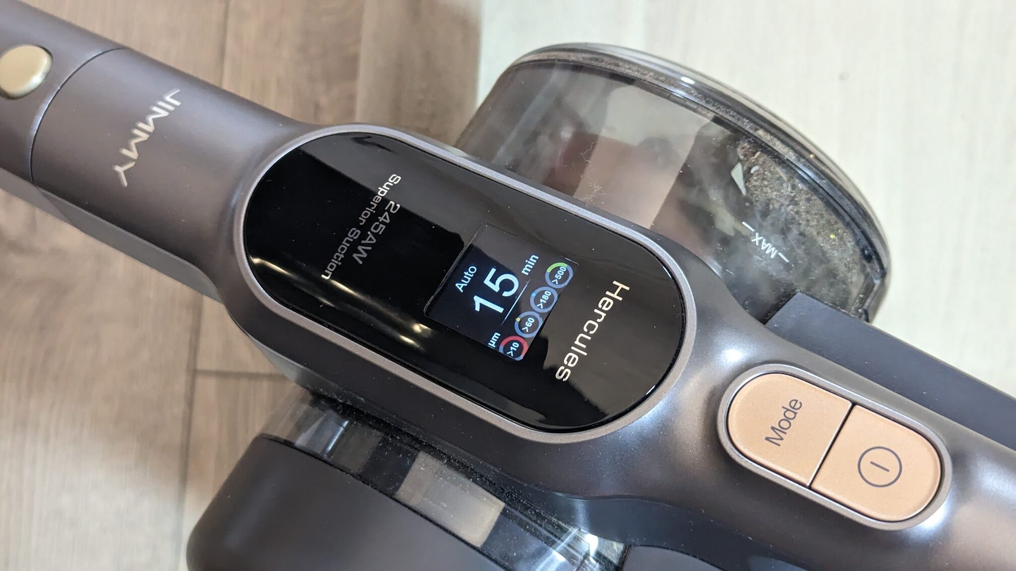 Detrás de los botones se encuentra una pantalla LED informativa que muestra toda la información importante: nivel de batería, modo seleccionado y mensajes de servicio. Además, la aspiradora puede contar automáticamente el tamaño de las partículas de suciedad y polvo recogidas, recopilando estadísticas de limpieza. Otra solución inteligente de los ingenieros de Jimmy.