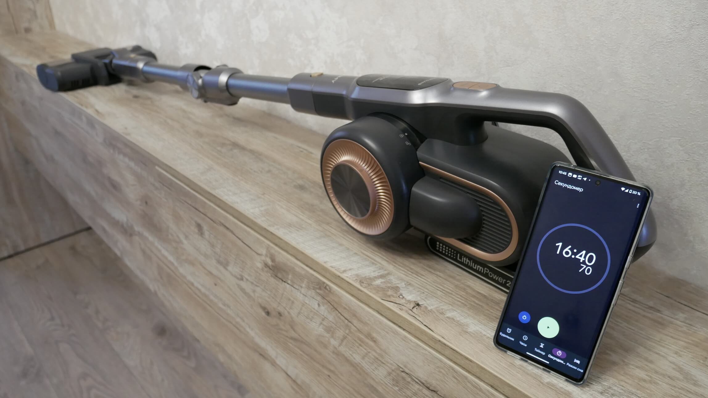 Y finalmente, pasemos a las pruebas. Primero, comprobemos la autonomía de la Jimmy H10 Pro Hercules a máxima potencia. La aspiradora funcionó durante 12 minutos y 7 segundos a máxima potencia, luego redujo la potencia automáticamente y funcionó durante otros 4 minutos y 33 segundos antes de que la batería se descargara por completo. Eso da un total de 16 minutos y 40 segundos de autonomía. ¡Un buen resultado!