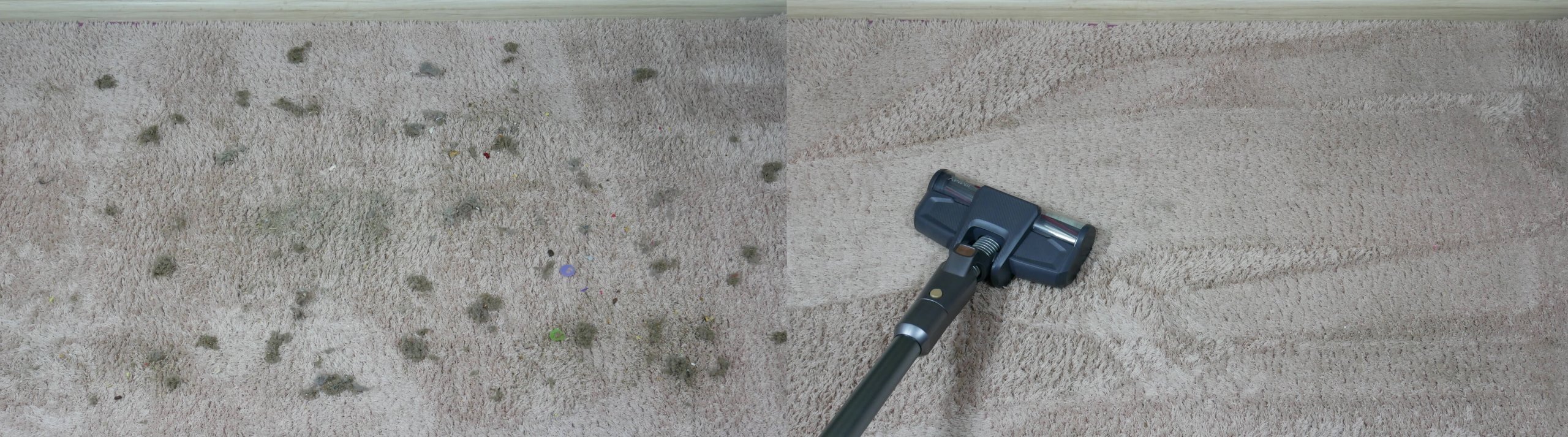 Hablando de limpieza de alfombras, para esta prueba se instaló el rodillo reemplazable de cerdas y pétalos. La aspiradora funcionó bien, limpiando la alfombra a fondo. El rodillo tampoco recogió pelos ni pelusas. ¡Otra prueba superada!