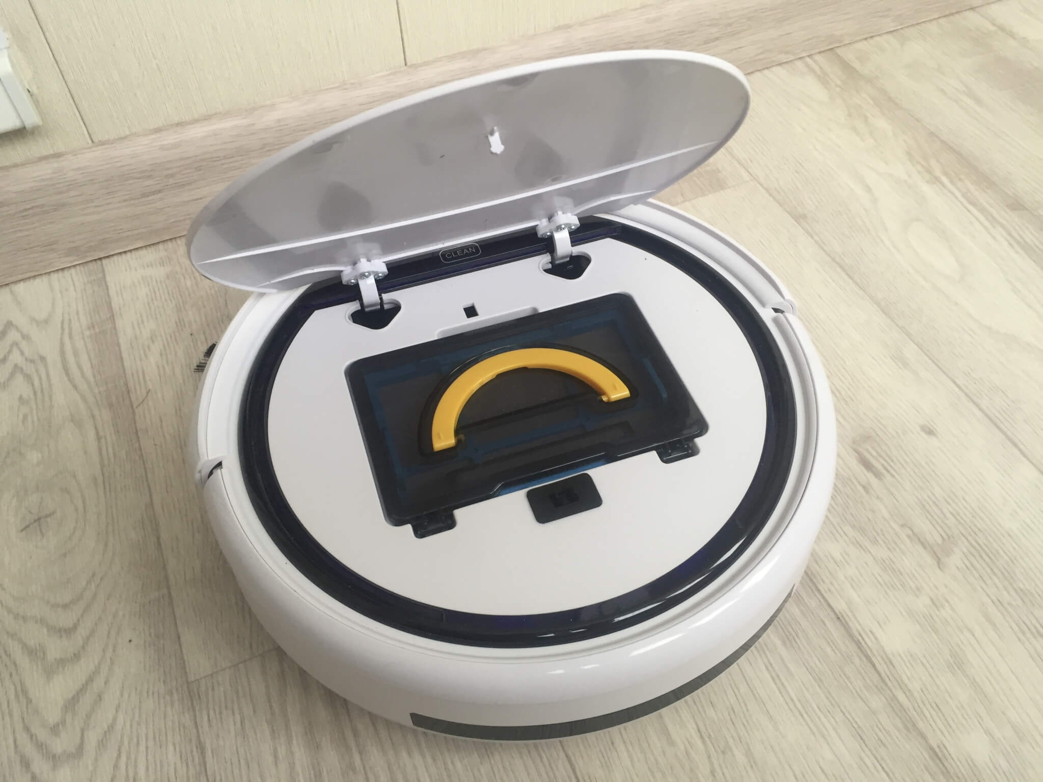 El robot aspirador Kitfort cuenta con un filtro de alta calidad que purifica el aire. Se encuentra en el depósito de polvo. Para vaciarlo, abra la tapa del compartimento y extraiga el depósito tirando del asa amarilla.
