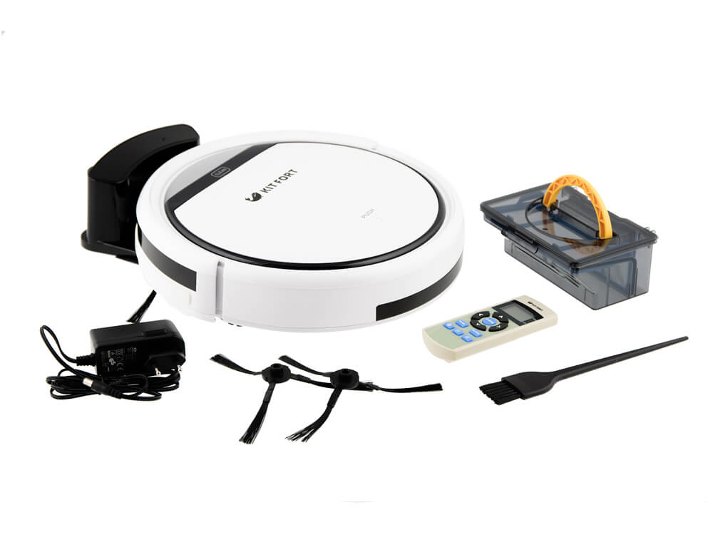 El paquete del robot aspirador incluye una base de carga y una fuente de alimentación. Kitfort se controla mediante un control remoto IR. También incluye un filtro de polvo de repuesto y dos cepillos laterales. Para un mantenimiento rápido y sencillo, se incluye un cepillo para limpiar el filtro y los sensores. El kit también incluye instrucciones de uso y una tarjeta de garantía.