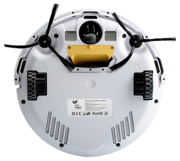 Si miras la parte inferior del dispositivo, verás los cepillos laterales, dos ruedas principales y una rueda giratoria. También en la parte inferior hay sensores de altura infrarrojos que evitan que el Kitfort se caiga por las escaleras.