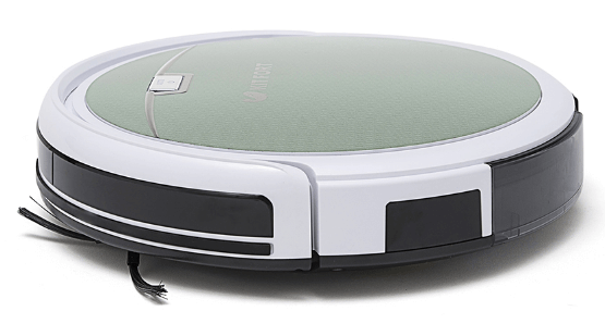 Este robot aspirador está disponible en cuatro colores: verde claro (KT-519-1), plateado (KT-519-2), dorado (KT-519-3) y marrón (KT-519-4). La parte inferior está pintada de negro. Su acabado mate claro permite ver el robot aspirador en zonas oscuras del apartamento y reduce el riesgo de pisarlo mientras está en funcionamiento. En el panel frontal hay un botón grande con la etiqueta "Auto".