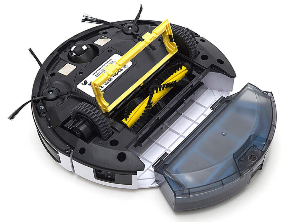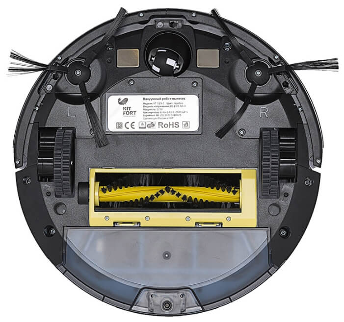 Una vista de la parte inferior de la unidad revela un rodillo guía, dos ruedas motrices, dos cepillos laterales, un cepillo principal, un compartimento para la batería y una tapa para el depósito de polvo. También se encuentran sensores en los bordes de la unidad que notifican los cambios de altura, evitando que la aspiradora robótica KT-519 se caiga por las escaleras.