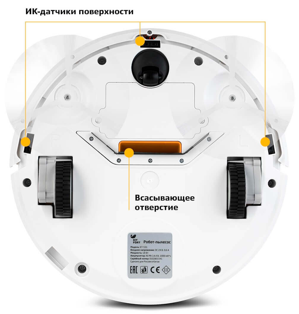 El lateral del robot cuenta con un parachoques suave, un orificio de ventilación, un puerto de carga y un interruptor de encendido. La parte inferior del Kitfort KT-531 cuenta con dos ruedas laterales, un rodillo giratorio frontal, cepillos laterales izquierdo y derecho, un puerto de succión, sensores de superficie y una tapa para el compartimento de la batería.