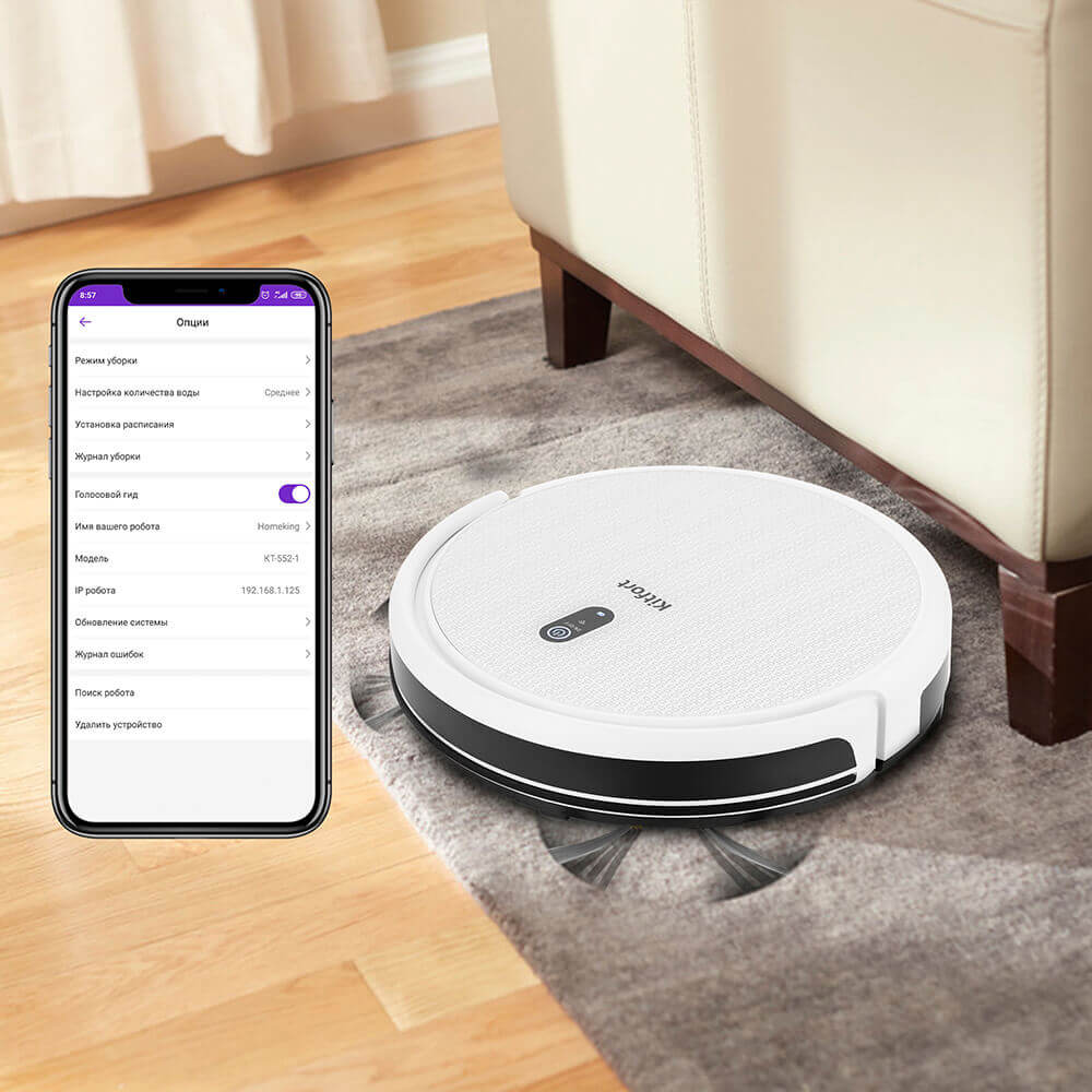 Puedes encender y apagar el robot aspirador Kitfort KT-552 y configurar el modo de funcionamiento deseado con el control remoto o la app RoboKit. La app te permite controlar el dispositivo desde tu smartphone por wifi, así que incluso cuando no estés en casa, puedes encender el robot, configurar el modo de limpieza y programarlo.