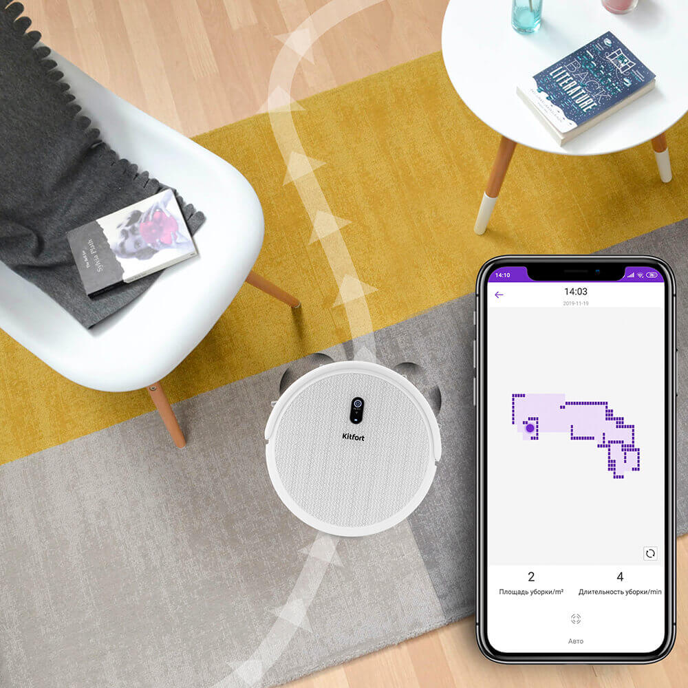 Para mejorar la eficiencia de limpieza, el modelo Kitfort KT-552 cuenta con una función de mapeo de habitaciones, que se puede ver en la aplicación para smartphones. Analizaremos las funciones de la aplicación con más detalle más adelante en la reseña.