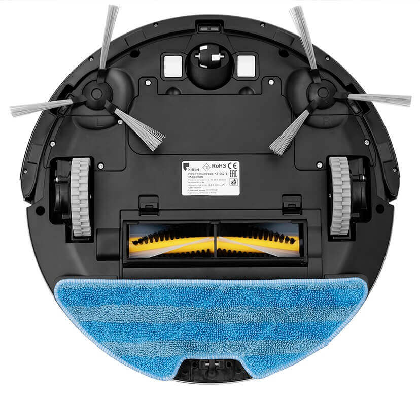 La parte inferior del Kitfort KT-552 cuenta con dos ruedas motrices, una rueda giratoria, contactos de carga, compartimento para la batería, cepillos laterales y un cepillo turbo central. Por cierto, el cepillo central es de cerdas de pétalos.