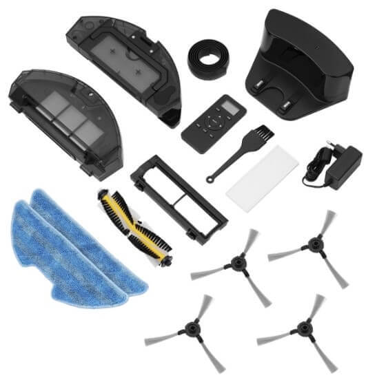 - Una aspiradora robótica con un cepillo turbo instalado, un módulo de limpieza con bomba y un contenedor de polvo.