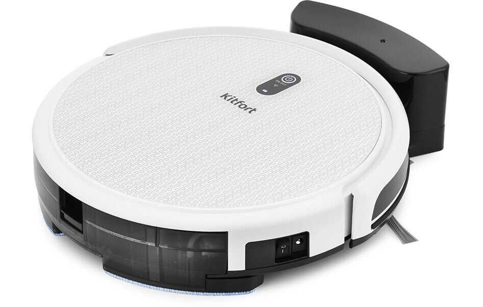 El panel frontal del Kitfort KT-552 cuenta con un botón de inicio con un pequeño panel de control y el logotipo de la empresa. El módulo de limpieza/depósito de polvo se puede extraer por la parte trasera, y el paño de microfibra incluido se fija en la parte inferior. La parte frontal del robot aspirador cuenta con un parachoques protector, mientras que el lateral cuenta con un botón de encendido y un puerto de carga para la carga directa.