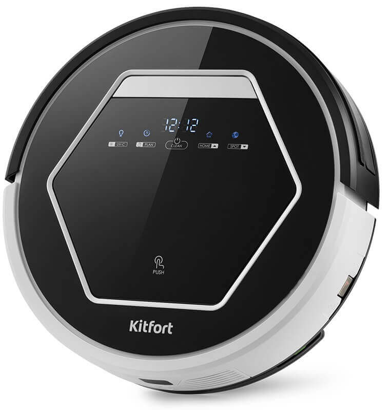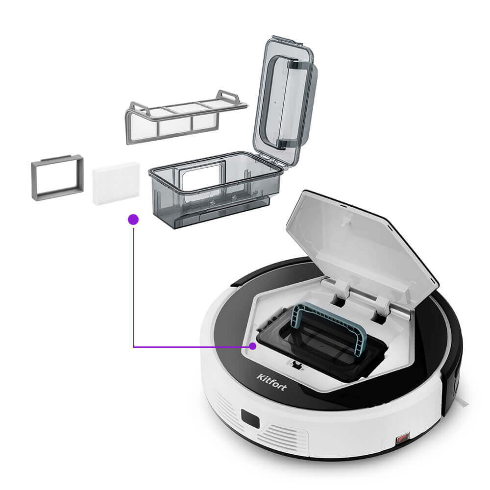La parte superior del robot aspirador cuenta con una tapa con botón de elevación que revela un depósito de polvo de 450 mililitros con sistema de filtración dual. La tapa alberga una pantalla y un panel de control con botones táctiles. El logotipo de Kitfort también aparece aquí.