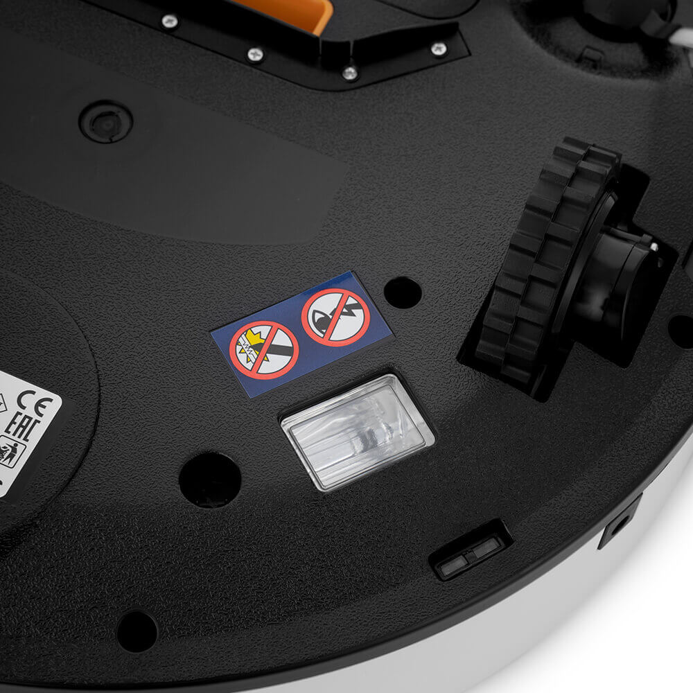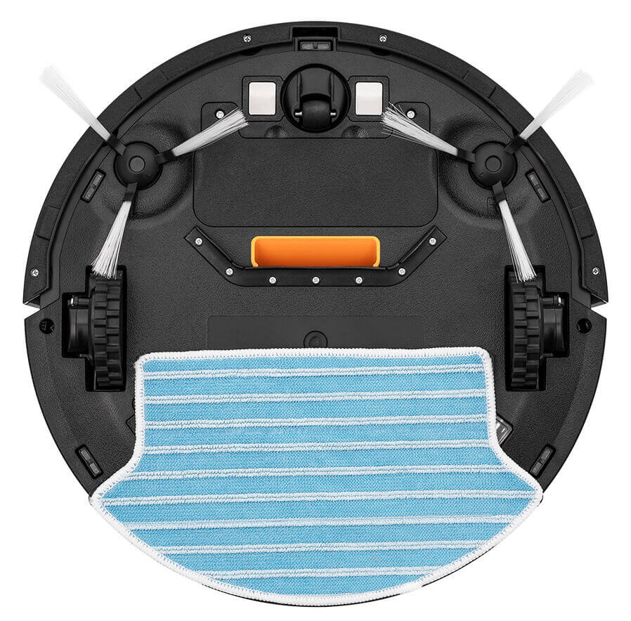 La parte inferior del Kitfort KT-553 cuenta con ruedas motrices grandes, una pequeña rueda giratoria delantera, dos cepillos laterales, un conducto de succión, un compartimento para la batería bajo la tapa, contactos para la conexión a la estación de carga y una lámpara ultravioleta para desinfectar el suelo. También cuenta con un área de montaje para un módulo de limpieza en húmedo extraíble con un paño de microfibra.